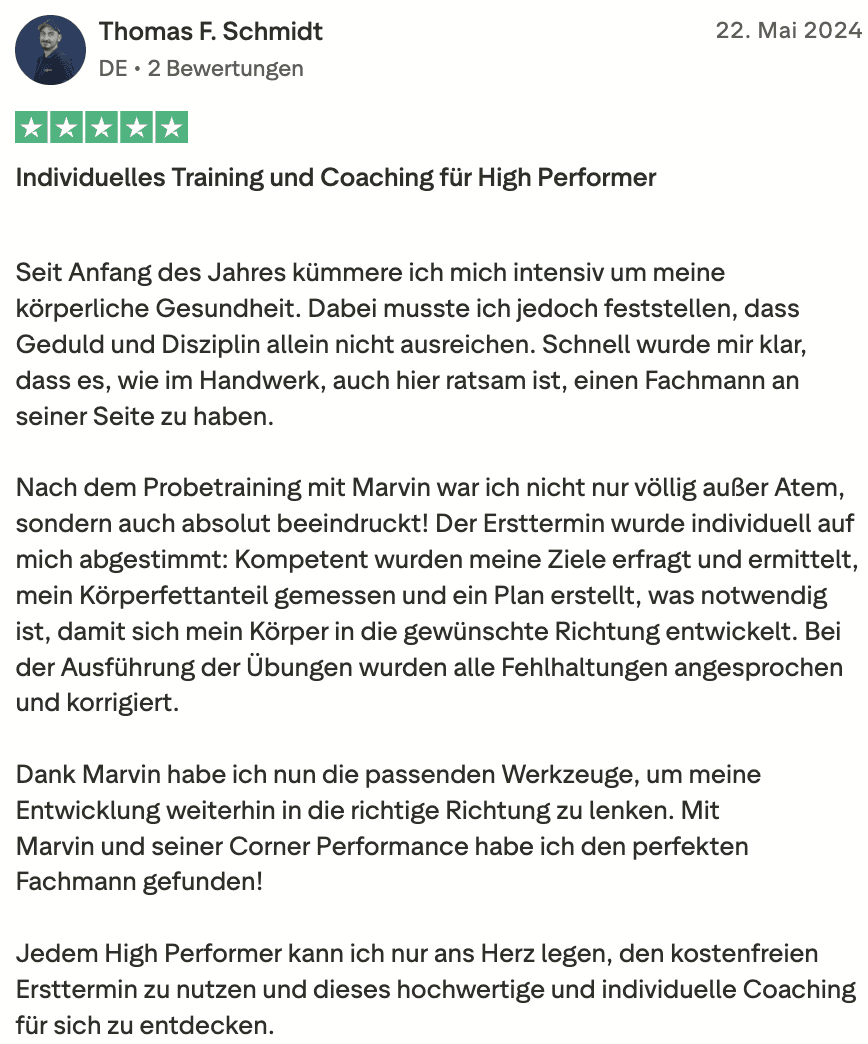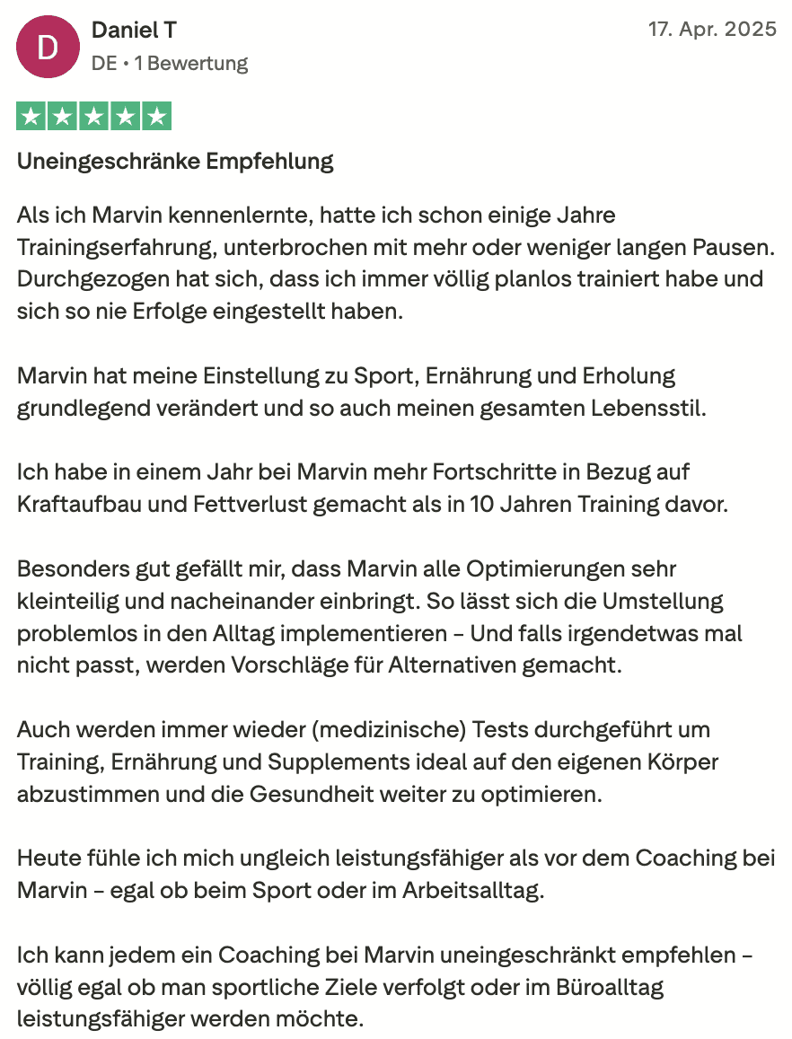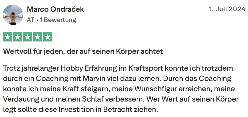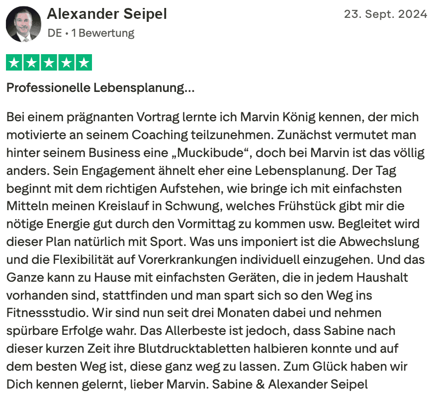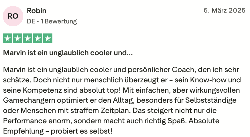 "Ich kann das Wissen und die Strategie von Marvin König empfehlen, weil ich mir nicht nur mehr Zeit spare, sondern weil ich mich viel besser fühle, produktiver bin und mehr geschafft bekomme."